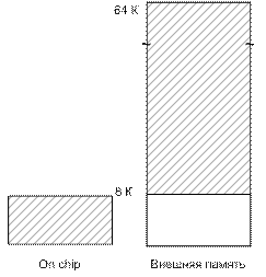 Схема 8. Сравнение объемов памяти на кристалле и внешней памяти I 8051 – базовый МК (память программ на кристалле – 2 К) I 8031 – не имел памяти программ