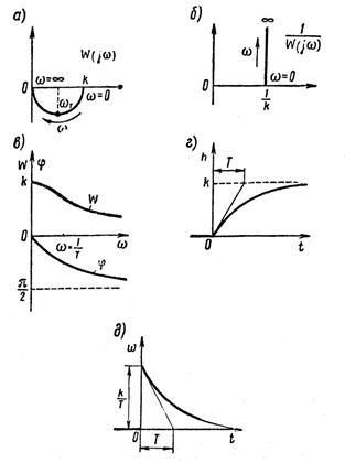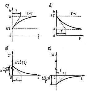 Графики переходной и весовой функций инерционного звена показаны на рисунке 1.7.8, г и д.