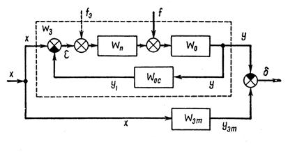 Рисунок 2.4.1 – Структурная схема системы автоматического управления Качество процессов отработки типовых сигналов x и f порознь оценивают либо непосредственно по управляемой переменной системы — её выходу y, либо по ошибке системы