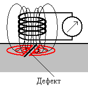 Электромагнитный вид контроля содержит только два метода: вихретоковая дефектоскопия и вихретоковая толщинометрия. Оба эти метода основаны на вихревых токах (токах Фуко), создаваемых в электропроводных материалах, и поэтому в отличие от магнитных методов могут применяться на любых твердых металлах. С помощью вихретоковой дефектоскопии можно выявлять наружные и подповерхностные (не глубже 2 мм) дефекты раскрытием от 1 мкм и более. Метод действует таким образом (см. рисунок 17).