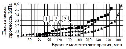 Рис.4.1. Кинетика структурной прочности теста нормальной густоты на новороссийском (1), воскресенском (2) и карачаево-черкесском (3) портландцементах