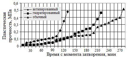 Рис.4.2. Кинетика пластической прочности цементного теста на активированном, гидратированном и обычном портландцементах