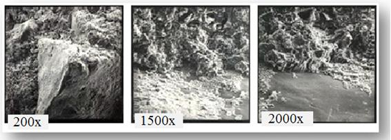 Рис.5.11. Общий вид строения и отдельные участки контактной зоны традиционно изготовленного бетона (новороссийский ПЦ500-Д0, раствор Ц:П=1:2, В/Ц=0,6)