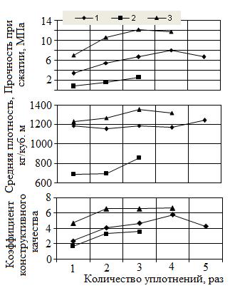 Рис.6.12. Влияние циклического вибрирования на прочность, среднюю плотность и коэффициент конструктивного качества неавтоклавного пенобетона без ускорителя (1,2) и с ускорителем твердения (3)