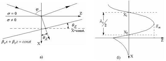 У неоднородной плоской волны поверхности равной амплитуды и поверхности равной фазы не совпадают. Поверхность равной амплитуды перпендикулярна оси х, т.е. на рисунке 4.1,а показана как х=const. Поверхности равной фазы соответствует плоскость Во второй среде направление распространения волны образует угол qД с осью x. qД - истинный (действительный) угол:
