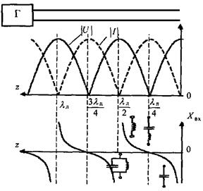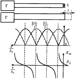 2) Короткое замыкание Zн=0 (режим стоячих волн). Отличается только сдвигом кривых для U и I на l/4 (см. рисунок 10.2). Входное сопротивление линии в режиме короткого замыкания описывается формулой
