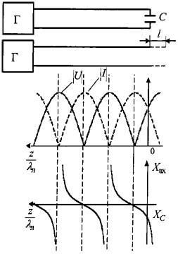 При реактивной нагрузке, активная мощность в ней выделяется и модуль /R/=1. Задачу проще всего решать, заменяя сосредоточенную C (см. рисунок 10.3) или L (см. рисунок 10.4) на отрезок линии, т.е:
