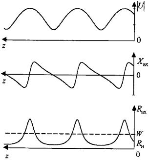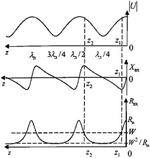 4) Чисто активная нагрузка (Zн=Rн). Возможны два случая активной нагрузки: 1. Rн>Zв, КБВ=Zв/Rн. 2. Rн<Zв, КБВ=Rн/Zв. В обоих случаях режим работы линии – смешанный (см. рисунок 10.5). Амплитуда отраженной волны меньше падающей (часть энергии потребляется нагрузкой). Эпюры напряжения и входного сопротивления в линии, нагруженной на активное сопротивление, показаны на рисунке 10.6.