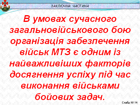 В умовах сучасного загальновійськового бою організація забезпечення військ МТЗ є одним із найважливіших факторів досягнення успіху під час виконання військами бойових задач. (Слайд № 14)