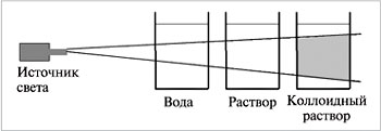 8.4. МЕТОДЫ ИССЛЕДОВАНИЯ ДИСПЕРСНЫХ СИСТЕМ Методы исследования дисперсных систем (определение размера, формы и заряда частиц) основаны на изучении их особых свойств, обусловленных гетерогенностью и дисперсностью, в частности оптических. Коллоидные растворы обладают оптическими свойствами, отличающими их от настоящих растворов, – они поглощают и рассеивают проходящий через них свет. При боковом рассматривании дисперсной системы, через которую проходит узкий световой луч, внутри раствора на темном фоне виден светящийся голубоватый так называемый конус Тиндаля (рис. 3). То же самое происходит, когда мы замечаем в пыльной комнате светлую полосу солнечного света из окна. Это явление называется опалесценцией.