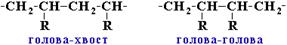 · линейные полимеры имеют наибольшую плотность, · полимеры сетчатого строения, не плавятся, не растворяются · Сетчатые структуры могут быть получены из термореактивных полимеров. По стереорегулярности: Структурные звeнья несимметричного строения, например, могут соединяться между собой двумя способами: