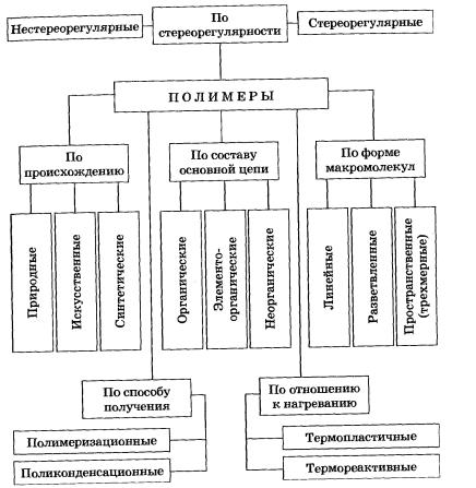 - (Стерео) регулярные полимеры - макромолекулы построены одним из этих способов --Полимеры нерегулярного строения образованы произвольным сочетанием По происхождению: Искусственные полимеры – из природных органических полимеров (ацетилцеллюлоза или ацетатный шелк - из целлюлозы) Синтетические полимеры - из органических низкомолекулярных соединений. По составу основной цепи: Органические:I. Карбоцепные – осн.цепи построены только из атомов С. II. Гетероцепные –помимо С, содержат гетероатомы (O,N,P,S и т.д.) Каучуки, целлюлоза, крахмал, органическое стекло Элементоорганические – основные цепи макромолекул содержат элементы, не входящие в состав природных органических соединений (Si, Al, Ti, B, Pb, Sb, Sn и др.) Неорганические: кварц, силикаты, алмаз, графит, корунд, карбин, карбид бора. –. Органические природные п олимеры – биополимеры: (обеспечивают процессы жизнедеятельности животных и раститений) 1. Нуклеиновые кислоты -ДНК, РНК (построены из:азотистое основание+ моносахарид+ остаток фосфорной кислоты) 2. Белки -полипептиды (из остатков α-аминокислот) 3. Полисахариды - целлюлоза, крахмал, гликоген (из ост. моносахаридов;. – целлюлоза, крахмал из глюкозы) 4. Полиизопрены -натуральный каучук, гуттаперча и др. (из1,4- цис -изопрена) По отношению к нагреванию: Термопластичные - полимеры линейной или разветвлённой структуры. Свойства обратимы при многокр.нагревании и охлаждении; Термореактивны е - некоторые линейные и разветвлённые полимеры, макромолекулы которых при нагревании соединяются друг с другом; при этом образуются пространственные сетчатые структуры. После прогрева обычно становятся неплавкими и нерастворимыми – происходит процесс их необратимого отверждения. По способу получения: 1.Полимеризация –последоват. присоединение молекул мономера к растущей цепи. 1. В основе лежит реакция присоединения. 2.Является цепным процессом, т.к. включает стадии инициирования, роста и обрыва цепи. 3. Элементный состав (молекулярные формулы) мономера и полимера одинаков. 2.Пoликонденсация – протекает по механизму замещения и сопровождается выделением побочных низкомолекулярных продуктов. Получение капрона из ε-аминокапроновой кислоты: n H2N-(CH2)5-COOH