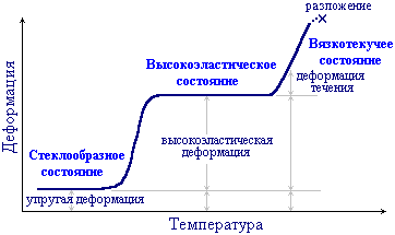 · Для стеклообразных полимеров характерны относительно небольшие упругие (обратимые) деформации (1-10%). Причем полимерные стекла отличаются повышенной прочностью от низкомолекулярных стеклообразных тел, которые разрушаются при деформировании уже на 0,1-1%. Полимеры в стеклообразном состоянии применяются в производстве пластмасс. · Высокоэластические полимеры способны обратимо деформироваться на сотни процентов. В высокоэластическом состоянии в условиях эксплуатации находятся все каучуки. Это состояние характерно лишь для полимеров. · В вязкотекучем состоянии полимер ведет себя как очень вязкая жидкость, которая под действием силы проявляет необратимую деформацию (деформацию течения). Это состояние реализуется обычно при повышенных температурах и используется для переработки полимеров в изделия