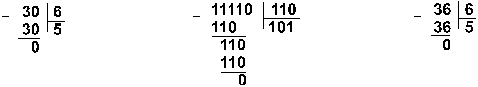 Деление в любой позиционной системе счисления производится по тем же правилам, как и деление углом в десятичной системе. В двоичной системе деление выполняется особенно просто, ведь очередная цифра частного может быть только нулем или единицей. Пример 9. Разделим число 30 на число 6.