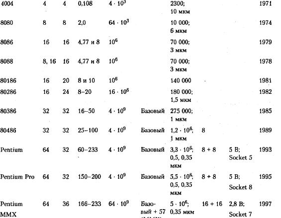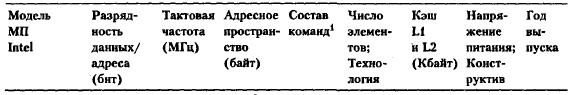 Большинство современных ПК типа IBM PC используют МП типа CISC, выпускаемые многими фирмами: Intel, AMD, Cyrix, IBM и т. д. Законодателем «мод» здесь выступает Intel, но ей «на пятки» наступает AMD, в последние годы создавшая МП по некоторым параметрам лучше «интеловских». Все же пока МП фирмы Intel имеют большее распространение; характеристики некоторых из них приведены в табл. Таблица. Характеристики некоторых CISC МП