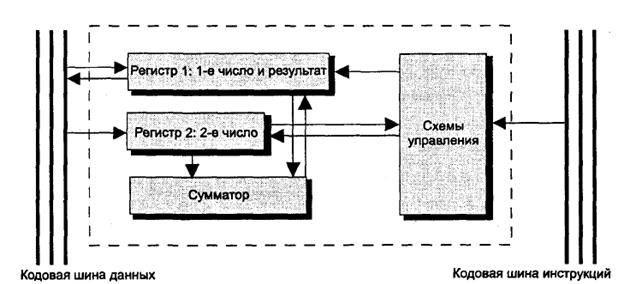 Арифметико-логическое устройство (АЛУ) предназначено для выполнения арифметических и логических операций преобразования информации. Функционально АЛУ (рис. 5.2) состоит обычно из двух регистров, сумматора и схем управления (местного устройства управления). Сумматор — вычислительная схема, выполняющая процедуру сложения поступающих на ее вход двоичных кодов; сумматор имеет разрядность двойного машинного слова. Регистры — быстродействующие ячейки памяти различной длины: регистр 1 имеет разрядность двойного слова, а регистр 2 — разрядность слова. При выполнении операций в регистр 1 помещается первое число, участвующее в операции, а по завершении операции — результат; в регистр 2 — второе число, участвующее в операции (по завершению операции информация в нем не изменяется). Регистр 1 может и принимать информацию с кодовых шин данных и выдавать информацию на них; регистр 2 только получает информацию с этих шин. Схемы управления принимают по кодовым шинам инструкций управляющие сигналы от устройства управления и преобразуют их в сигналы для управления работой регистров и сумматора АЛУ. АЛУ выполняет арифметические операции «+», «-», «х» и «> только над двоичной информацией с запятой, фиксированной после последнего разряда, то есть только над целыми двоичными числами. Выполнение операций над двоичными числами с плавающей запятой и над двоично-кодированными десятичными числами осуществляется с привлечением математического сопроцессора или по специально составленным программам. Рассмотрим в качестве примера выполнение команды умножения. Перемножаются числа 1101 и 1011 (числа для простоты взяты 4-битовыми). Множимое находится в регистре 1, имеющем удвоенную по отношению к регистру 2 разрядность; множитель размещается в регистре 2. Операция умножения требует для своеговыполнения нескольких тактов. В каждом такте число из регистра 1 проходит в сумматор (имеющий также удвоенную разрядность) только в том случае, если в младшем разряде регистра 2 находится 1. В данном примере в первом такте число 1101 пройдет в сумматор, и в этом же первом такте число в регистре 1 сдвигается на 1 разряд влево, а число в регистре 2 — на 1 разряд вправо. В конце такта после сдвигов в регистре 1 будет находиться число 11010, а в регистре 2 — число 101. Во втором такте число из регистра 1 пройдет в сумматор, так как младший разряд в регистре 2 равен 1; в конце такта числа в регистрах опять будут сдвинуты влево и вправо, так, что в регистре 1 окажется число 110100, а в регистре 2 — число 10. В третьем такте число из регистра 1 не пройдет в сумматор, так как младший разряд в регистре 2 равен 0; в конце такта числа в регистрах будут сдвинуты влево и вправо, так что в регистре 1 окажется число 1101000, а в регистре 2 — число 1. На четвертом такте число из регистра 1 пройдет в сумматор, поскольку младший разряд в регистре 2 равен 1; в конце такта числа в регистрах будут сдвинуты влево и вправо, так что в регистре 1 окажется число 11010000, а в регистре 2 — число 0. Поскольку множитель в регистре 2 стал равным 0, операция умножения заканчивается. В результате в сумматор последовательно поступят и будут сложены числа: 1101, 11010, 1101000; их сумма 10001111 (143 в десятичной системе) и будет равна произведению чисел 1101 х 1011 (13 х 11 десятичные).