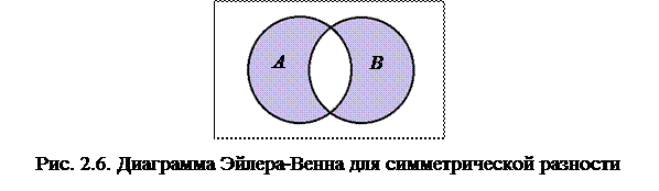 Диаграмма Эйлера-Венна для симметрической разности множеств приведена на рис. 2.6. Закрашенная область соответствует множеству, получаемому симметрической разностью множеств A и B.