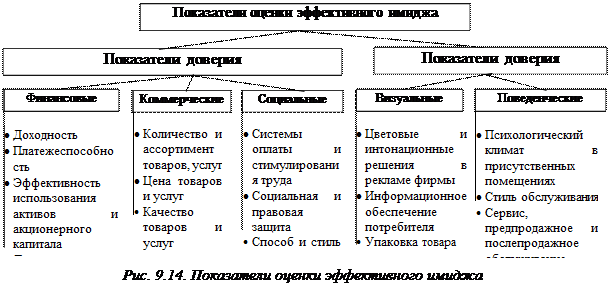 Организация службы имиджа Постоянство усилий по созданию имиджа Импульсивность – главный враг при создании имиджа предпринимателя. Основные требования – всесторонность и последовательность освещения деятельности предприятия; организация стабильных потоков информации как внутри самого предприятия, так и во внешнем его окружении. Известно, что наибольшего успеха чаще добиваются те предприятия, которые создают специальные подразделения или приглашают специалистов, отвечающих за проведение коммуникационной политики. Следует всегда помнить девиз: «Правильная организация мероприятий по созданию деловой репутации предприятия гораздо важнее их финансирования». Некоторые правила создания деловой репутации предприятия: 1) Образ фирмы, сконструированный специалистами, и ее репутация, закрепившаяся в сознании потребителей, должны соответствовать друг другу. 2) Создаваемый образ должен основываться на реальных возможностях и достоинствах фирмы. 3) Имидж должен быть оригинальным, простым, понятным, легко запоминающимся и распознаваемым. 4) Образ фирмы обязан быть пластичным и, оставаясь неизменным в воспроизведении потребителей, оперативно изменять форму в ответ на изменения экономической, социальной, психологической ситуации, моды и т.д. В оценке эффективного имиджа (деловой репутации) в бизнесе можно выделить две большие и динамичные группы показателей. К первой относятся показатели доверия, ко второй – показатели привлекательности (рис. 9.14).