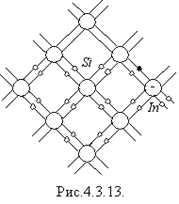 Напівпровідники з донорною провідністю мають більшу кількість електронів порівняно з кількістю дірок. Їх називають напівпровідниками n -типу. У них електрони є основними носіями заряду, а дірки - неосновними. Коли як домішку використовують індій (In), атоми якого тривалентні, то характер провідності силіцію зміниться. Тепер для встановлення нормальних парно-електронних зв'язків із сусідами атома індію не вистачає електрона. Унаслідок цього утворюється дірка. Кількість дірок у кристалі дорівнюватиме кількості атомів домішки (рис. 4.3.13). Домішки цього типу називають акцепторними (приймальними). Напівпровідники з переважанням діркової провідності над електронною називають напівпровідниками р -типу. Основними носіями заряду таких напівпровідників є дірки, а неосновними - електрони.
