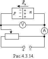Цікаві явища спостерігаються під час контакту напівпровідників n - і р -типів. З'єднаємо два напівпровідники: один з донорною, а другий з акцепторною домішкою. Контакт двох напівпровідників називають р - n -переходом (рис. 4.3.14). На межі контакту електрони частково переходять із напівпровідника n -типу в напівпровідник р -типу, а дірки - навпаки. Якщо подати напругу на напівпровідник з р - n -переходом так, щоб до напівпровідника р -типу під'єднувався позитивний полюс батареї, а на n -типу - негативний, то при цьому струм через р - n перехід забезпечується основними носіями: з n -типу в р -тип - електронами, а із р -типу в n -тип - дірками. Унаслідок цього провідність усього зразка велика, а опір малий. Такий перехід називають прямим. Під'єднаємо батареї навпаки. Струм I в колі стане незначним за тієї ж напруги U, оскільки струм через р - n перехід забезпечується неосновними носіями заряду і провідність зразка стає незначною, а опір великим. Утворюється так званий запірний шар. Цей перехід називають зворотним. На вольт-амперній характеристиці залежність сили прямого струму від напруги зображено лінією зростаючою в додатному напрямі осі напруги U (рис. 4.3.13). Після перемикання полюсів батареї, коли потенціал напівпровідника р -типу буде від'ємним, а потенціал напівпровідника n -типу - додатним, опір переходу зростає, а струм стає незначним. Напрям руху дірок протилежний рухові електронів. Тому напівпровідники мають електронну і діркову провідності (рис. 4.3.15).