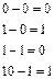 При відніманні необхідно пам'ятати, що зайнята в найближчому старшому розряді «1» дає дві одиниці в молодшому розряді. Якщо в сусідніх старших розрядах стоять нулі, то доводиться займати «1» через декілька розрядів; при цьому одиниця, зайнята в найближчому значущому старшому розряді, дає дві одиниці молодшого розряду і одиниці у всіх нульових розрядах, що стоять між молодшим і тим старшим розрядом, у якого бралася одиниця.