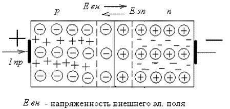 На границе этих полупроводников – рекомбинация основных носителей заряда и образуется электрический диполь, который создает запирающее электрическое поле Езп. Диффузия основных носителей образует диффузионный ток. Под действием эл. поля происходит дрейф неосновных носителей, которые образуют дрейфовый ток Эти токи равны и направлены встречно. Подключим внешний источник полярностью (+ -).