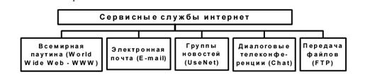 Интернет предоставляет своим клиентам целый ряд услуг (сервисов), называемых службами (рисунок 5.6). Наиболее часто используются следующие службы: электронная почта, сервис WWW, служба новостей, передача файлов и т. д.