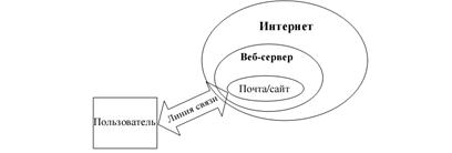 Рисунок 5.8– Схема работы пользователя с почтой и сайтом Веб-почта — работа с почтой в браузере на веб-сервере. Файлы, содержащие письма пользователя, размещаются в почтовом ящике на сервере хостинга на жестком диске. Там же размещается сайт пользователя либо в виде его личных html-файлов, либо страниц, собранных из предложенных на сервере форм, заполненных пользователем. Зарегистрироваться и получить бесплатную электронную почту и организовать свой сайт в Интернете можно, например, на двух бесплатных серверах хостинга со следующими адресами: 1) www.newmail.ru. Бесплатная регистрация и размещение электронной почты и сайта на доменах newmail.ru, hotmail.ru, nm.ru и nightmail.ru; 2) narod.yandex.ru. Бесплатный хостинг на домене narod.ru. Портал — это мощный сайт, объединяющий несколько отдельных тематических сайтов одного направления и предоставляющий несколько сервисов. Поисковый сервер, или поисковая машина, или поисковая система — сайт, на котором оказываются услуги по контекстному поиску информации в Интернете. Два поисковых сервера: 1) google.ru; 2) yandex.ru. Лента новостей — список ссылок на последние новости. Этот список постоянно обновляется: новые ссылки добавляются, старые удаляются. Форум — это веб-конференция. Библиотека — сайт с коллекцией текстов. Магазин — сайт по продаже товаров.