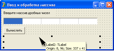 В качестве примера использования компонента StringGrid для ввода массива рассмотрим программу, которая вычисляет среднее арифметическое значение элементов массива. Диалоговое окно программы приведено на Рисунок 19.2 Компонент StringGrid используется для ввода массива, компоненты Label1 и Label2 — для вывода пояснительного текста и результата расчета, Buttoni — для запуска процесса расчета.