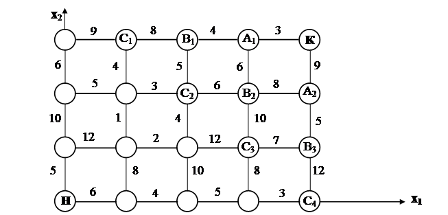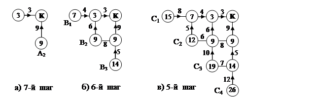 Решение задачи состоит в том, чтобы из множества возможных путей выбрать вариант, обеспечивающий минимум затрат на прокладку кабельной линии. По переменной x1 процесс решения можно разделить на 4 шага, по переменной x2 – на три. Общее число шагов равно семи. Выбор оптимального пути начинается с конечной точки К (рис. 15). В эту точку кабель может быть проложен либо из точки А1, либо из точки А2. Если на предпоследнем (шестом) шаге мы оказались в точке А1, то для прокладки кабеля из точки А1 в точку К необходимо затратить 3 единицы стоимости, а если в точке А2 – 9 единиц. Запишем эти значения в кружках, соответствующих точкам А1 и А2 (рис. 16, а) и обозначим оптимальные управления стрелками. Седьмой шаг спланирован.