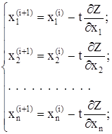 Переход от i -го к (i+ 1)-му приближению осуществляется по направлению, обратному градиенту (по антиградиенту), по выражениям: