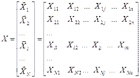 Например, значения факторов X1 и X2 в точке 1 равны соответственно X1min и X2min, а нормированные их значения: X1min= -1, X2min= -1. План эксперимента удобно представлять в матричной форме. План эксперимента задается либо матрицей плана, либо матрицей спектра плана в совокупности с матрицей дублирования. Матрица плана представляет собой прямоугольную таблицу, содержащую информацию о количестве и условиях проведения опытов. Строки матрицы плана соответствуют опытам, а столбцы – факторам. Размерность матрицы плана L´n, L- число опытов, n- число факторов. При построении повторных (дублирующих) опытов в одних и тех же точках плана матрица плана содержит ряд совпадающих строк. Матрица спектра плана – это матрица, в которую входят только различающиеся между собой строки матрицы плана. Размерность матрицы спектра плана N´n, где N- число точек плана, различающихся между собой хотя бы одной координатой:
