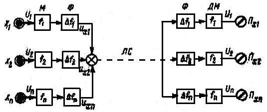 Рис 2.5.5 Здесь ДТр – дифференциальный трансформатор; Х- датчик телемеханической информации; Пх – приемник телемеханической информации. Частотное разделение – это когда различных каналов водятся неперекрываемые полосы частотой Спектры каналов Определяется крайними частотами fmin полосы f1 и fmax. Низкочастотные сигналы Uk датчиков Xr модулируют по амплитуде или частоте высокочастотные сигналы