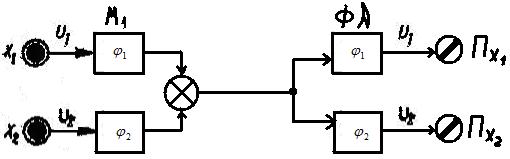 Рис. 2.5.4 В многоканальных системах тракты всех сигналов должны быть разделены, чтобы сигнал каждого источника информации мог попасть на свой приемник. Пусть Uk(t) –сигналы датчиков, несущие некоторую информационную функцию xk(t) и порождающие модуляцию параметров аk носителя. Тогда Uxk(t) –сигналы на выходах передающих устройств отдельных каналов. В линии связи в этом случае действует суммарный сигнал U(t). Тогда сигнал одного канала: