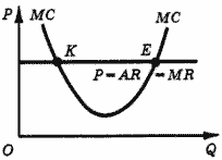 Фирма максимизирует прибыль в точке пересечения Е кривых предельной выручки (MR) и предельных затрат (МС). Естественно, речь идет о пересечении кривой предельного дохода с восходящей ветвью кривой предельных затрат. Рассмотрим рис. 4. Кривая МR пересекает кривую МС два раза (в точках K и Е), но в точке K предельные затраты снижаются (значит, прибыль возрастает), следовательно, фирма увеличивает свой выпуск до точки Е. Это условие максимизации прибыли называется условием второго порядка.