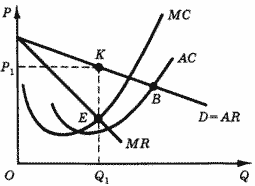 На рис. 7 кривые MR и МС пересекаются в точке Е, которой соответствует выпуск монополистом Q1 единиц продукции. В свою очередь объему выпуска Q1 соответствует точка K на кривой спроса и цена спроса P1.