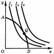 Следовательно, по мере увеличения производства товара Y в производство этого товара будут вовлекаться все менее приспособленные для его производства ресурсы, в результате чего производство каждой следующей единицы товара Y будет требовать отказа от производства все большего количества единиц товара Х (проявлением чего и является вогнутость линии АD). Попробуем теперь определить, какой набор продуктов будет производить Робинзон. Нам известно множество доступных ему продуктов, если предположить теперь, что нам известна и система его предпочтений (карта безразличия), мы легко сможем с помощью знакомой нам оптимизационной техники найти оптимальный (т. е. лучший из доступных) для Робинзона набор. Им будет набор Q, отображающийся на рис. 2 точкой касания границы производственных возможностей АD с наиболее высоко расположенной из пересекающих ее кривых безразличия.
