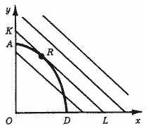 Тогда использование простейшей оптимизационной техники приводит нас к тому, что наибольший доход принесет Робинзону набор R, отображающийся на рис. 3 точкой пересечения границы производственных возможностей с наиболее высокой из пересекающих ее линий равного дохода.