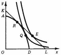 Реализовав на рынке набор R, Робинзон может приобрести на вырученные деньги любой набор товаров, лежащий на прямой KL, поскольку все эти наборы имеют одинаковую стоимость, равную выручке Робинзона (теперь прямая KL выступает как бюджетная линия Робинзона). Следующая задача Робинзона состоит в том, чтобы использовать свой доход, т. е. приобрести тот из ставших ему доступными наборов товаров, который несет для Робинзона наибольшую полезность. Эта задача представляет собой хорошо известную нам задачу нахождения потребительского оптимума (лекция 14). Как мы знаем, Робинзон достигает его в точке Е - точке касания бюджетной линии KL с наиболее высокой из пересекающих ее кривых безразличия (рис. 4).