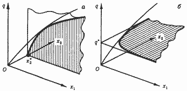 Производственную функцию вида (2) можно представить в трехмерном декартовом пространстве, две координаты которого (x1 и x2) откладываются на горизонтальных осях и соответствуют затратам ресурсов, а третья (q) откладывается на вертикальной оси и соответствует выпуску продукта (рис. 2). Графиком производственной функции служит поверхность "холма", повышающаяся с ростом каждой из координат x1 и x2. Построение на рис. 1 при этом можно рассматривать как вертикальный разрез "холма" плоскостью, параллельной оси x1 и соответствующей фиксированному значению второй координаты x2 = x*2.