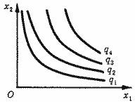 Будем считать, что увеличение затрат одного из ресурсов при неизменных затратах другого позволяет увеличить выход продукции. Это значит, что производственная функция - возрастающая функция каждого из своих аргументов. Через каждую точку плоскости ресурсов с координатами х1, х2 проходит единственная изокванта. Все изокванты имеют отрицательный наклон. Изокванта, отвечающая большему выходу продукта, располагается правее и выше изокванты для меньшего выхода. Наконец, все изокванты будем считать выпуклыми в направлении начала координат.