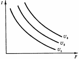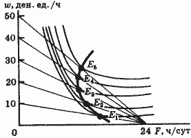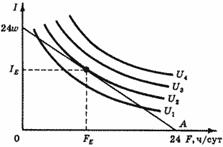 Аппарат кривых безразличия, использованный нами при анализе потребительского поведения, может оказать нам большую услугу и при анализе распределения времени между работой и досугом. На рис. 1 изображена карта кривых безразличия для дохода и досуга. По оси ординат откладываем величину ежедневного дохода (I), по оси абсцисс - величину досуга (F). Чем дальше находится кривая безразличия от начала координат, тем больший уровень полезности ей соответствует. На рис. 1 показаны только три из бесконечного множества кривых безразличия.