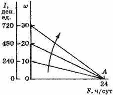 В этой точке, т. е. рабочий день индивида равен 24 ч. Ось абсцисс бюджетная линия пересекает в точке, где F = 24.