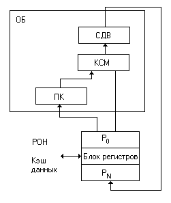 Рис. 7.3. Регистровая структура с закрепленной логикой В АЛУ с магистральной структурой регистры выделены в отдельный блок, а схемы для преобразования информации выделены также в отдельный операционный блок (ОБ), который связан с блоками регистров по входам и выходам (см. рис. 7.4). Блок регистров (БР) осуществляет функции приема, хранения и выдачи операндов и результатов, а ОБ выполняет весь набор микроопераций над словами, хранимыми в блоке регистров. В АЛУ с такой структурой блок регистров может быть реализован или как СОЗУ, или как совокупность отдельных регистров с индивидуальными схемами управления. Структура же ОБ имеет следующие модификации: ¨ последовательное соединение операционных узлов; ¨ параллельное соединение операционных узлов. Пример АЛУ с магистральной структурой с последовательным соединением узлов ОБ. В этом АЛУ преобразователь кода ПК, комбинационный сумматор КСМ и сдвигатель СДВ соединены последовательно, причем ПК и КСМ по входам связаны с выходными шинами блока регистров, а выход СДВ – с входной шиной блока регистров. Такая организация операционного блока дает возможность выполнять с высокой скоростью последовательности микроопераций, обеспечивающие выполнение одного слова.