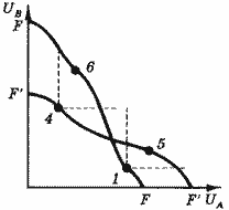 Такая ситуация может возникнуть, например, если структура продукции изменяется так, что полезность одного индивида увеличивается, а другого - уменьшается. Т. Скитовски (1941) заметил, что перемещение из точки 1 в точку 4 удовлетворяет критерию, поскольку посредством неискажающего перераспределения возможно перейти в такую точку, как например точка 5, которая, как мы видим, является парето-улучшением по отношению к положению в точке 1.