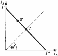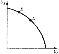 Предположим, индикатором благосостояния индивида является получаемая им полезность, которая в свою очередь зависит только от дохода индивида. По оси абсцисс будем откладывать доход, получаемый индивидом А (IA), а по оси ординат - доход индивида А (IB). Линия, проведенная под углом 45°, покажет нам равное распределение доходов между индивидами, поэтому назовем ее лучом равенства. Линия показывает, как один и тот же общественный "пирог" может быть разделен между двумя индивидами (т. е. является границей возможного дохода). Исходное распределение соответствует точке K, равное распределение доходов обозначено точкой L.