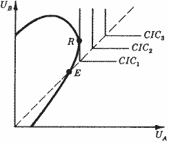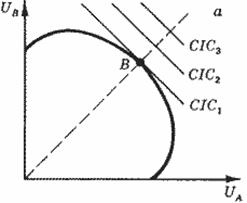 CIC для функции Бентама - прямые с угловым коэффициентом -1. Рис. 8 иллюстрирует утилитаристское решение проблемы выбора между эффективностью и справедливостью (проблемы распределения) для случая, когда полезность отдельного индивида зависит от дохода, получаемого другим индивидом.