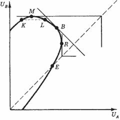 Допустим, что действие рыночного механизма привело к распределению полезностей, соответствующему точке K, так что один из членов общества (B) оказался богачом, а другой (A) - бедняком. Из рис. 5 видно, что переход в любую точку на участке KL будет улучшением по критерию Парето. В случае двух индивидов можно ожидать, что богач добровольно "поделится" с бедным (т. е. будет иметь место добровольный трансферт).