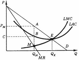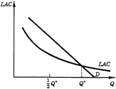 Предположим, кривая спроса (D) пересекает линию средних затрат (LAC) в точке минимума последней, т. е. мощности предприятия обеспечивают наличие возрастающей отдачи от масштаба для всего объема продукции, который следовало бы производить для достижения эффективности (т. е. который был бы в условиях совершенной конкуренции) (рис. 7).
