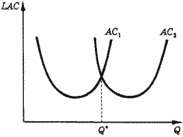 На рис. 5 линия AC1 представляет собой кривую средних затрат единственной фирмы в отрасли. Предположим, спрос на продукцию растет и число фирм увеличится до двух. Мы знаем, что при выпуске продукции с минимальными средними затратами каждая фирма должна производить одно и то же количество продукции, и, следовательно, предельные затраты двух фирм должны быть равны. Соответственно кривую затрат двух фирм (AC2) можно построить, удвоив уровень выпуска для каждой точки на AC1.